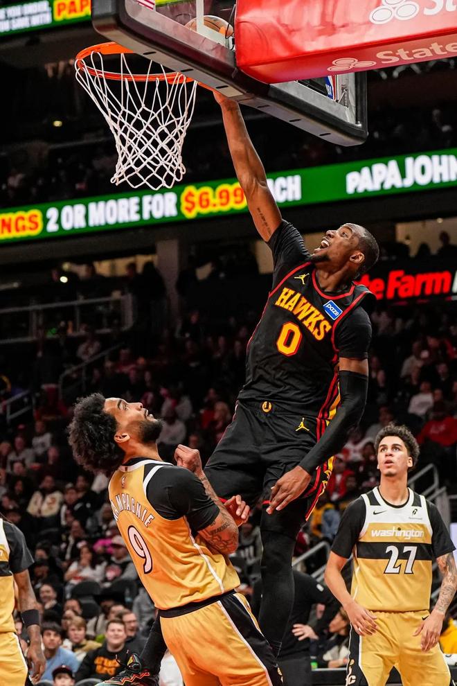 第一节还有一个球,库明加在突破到篮下已经起跳的情况下,依然找到了底角的队友,完成了一次三分助攻。在老鹰的首秀,库明加几近完美,唯一的瑕疵可能是在末节想要刷30分瞎打了两个。全场比赛他替补出战24分钟,12投9中,三分4中3,罚球7中6,砍下赛季新高27分7篮板4助攻2抢断,正负值+16。27分同时也是老鹰队史替补首秀的新高。