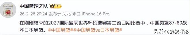 中国篮协官方社媒赛后更新社媒发文:在刚刚结束的2027国际篮联世界杯预选赛第二窗口期比赛中,中国男篮87-80战胜日本男篮。